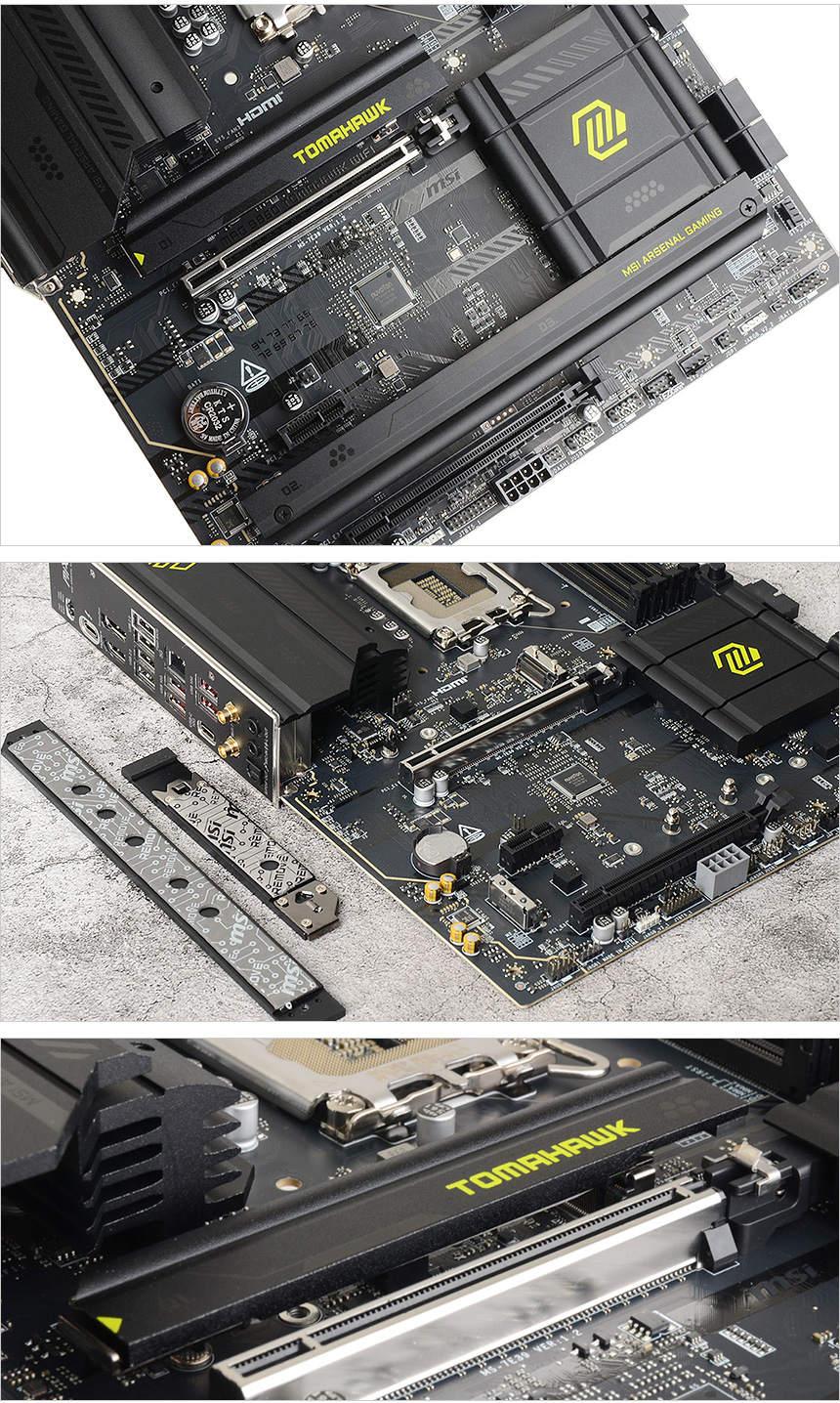 메인보드 좌측 하단에는 3개의 PCIe 슬롯이 설치되어 있다. 스틸아머가 설치된 첫 번째 슬롯은 PCIe 5.0 x16을 지원하며 (무거운 그래픽카드 장착으로 인한 슬롯의 파손 및 휘어짐 현상을 미연에 방지한다.) 두 번째 작은 슬롯은 PCIe 4.0 x1, 세 번째 큰 슬롯은 PCIe 4.0 x4를 지원한다.