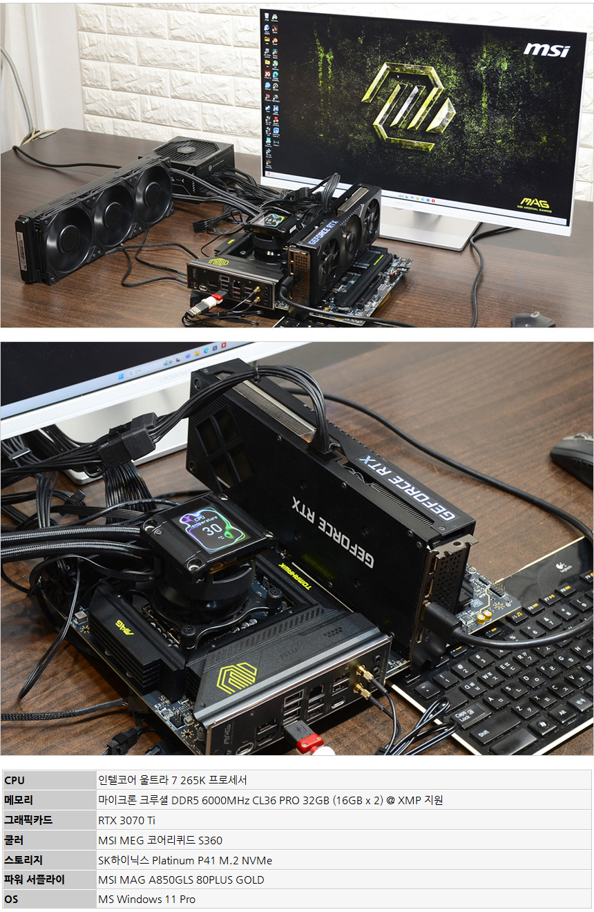 테스트를 위해 시스템을 구성한 모습으로 인텔코어 울트라 7 265K 프로세서를 사용했으며 7000MB/s 의 빠른 속도를 보여주는 SK하이닉스 P41을 비롯해 넉넉한 전원 공급을 위해 MSI MAG A850GLS 80PLUS GOLD와 XMP를 지원하는 오버클럭 메모리 마이크론 크루셜 DDR5 6000MHz CL36 PRO를 장착했다. (튜닝 메모리 구입후 XMP를 적용해 사용할 수 있으며 메모리 오버클럭을 통해 기본 메모리의 성능을 높일 수 있다.) 또한 RTX 3070 Ti 그래픽카드와 수랭쿨러 MSI MEG 코어리퀴드 S360을 장착했다.