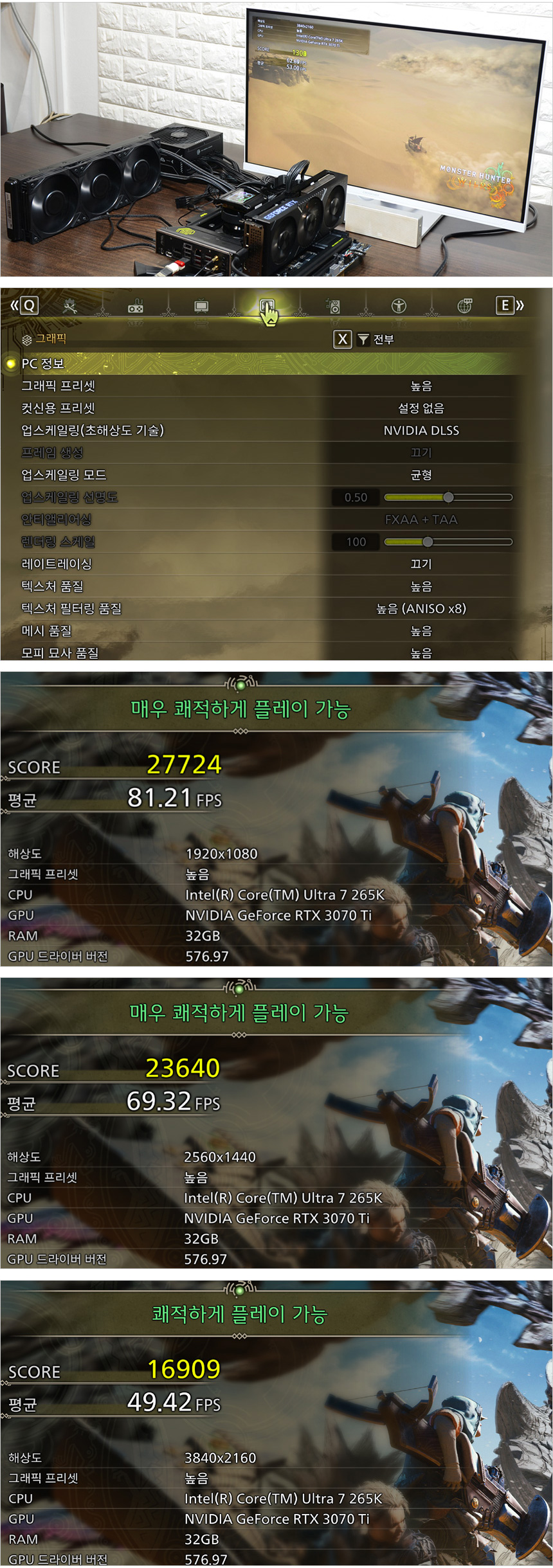 몬스터 헌터 와일드 벤치마크를 실행한 모습으로 4K 에서도 높은 프레임을 보여주었다. DLSS4를 적극적으로 활용할 수 있는 RTX 5060 Ti 정도의 그래픽카드를 사용한다면 훨씬 높은 프레임에서 게임을 즐길 수 있다.