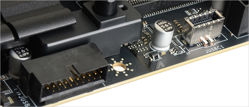 PC 케이스에서 C타입의 USB 3.2 Gen2 사용을 위한 JUSBC1 커넥터를 제공하며 JUSB1 (USB 3.2 Gen1) 커넥터가 설치된 것도 눈에 띈다. 또한 4개의 SATA 단자를 지원해 HDD를 손쉽게 장착해 저장 용량을 늘릴 수 있다.