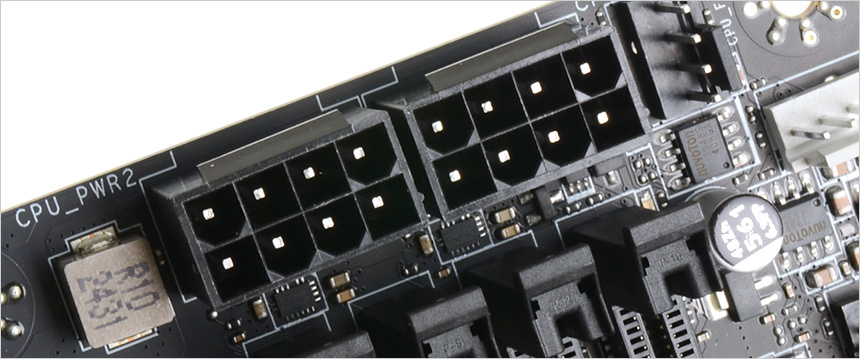 8핀 + 8핀의 CPU 전원부와 24핀 통합 전원부를 지원한다. CPU 및 시스템 전체를 과전압으로부터 보호하는 회로 설계로 안정성을 높였으며 디지털 전원 설계를 통해 CPU에 정밀하고 빠른 전력을 공급한다. 또한 2개의 8핀 커넥터가 멀티코어 프로세서의 추가적인 전력을 확보해 전압강하로 인한 시스템 불안정 현상없이 깔끔하게 PC를 사용할 수 있다.