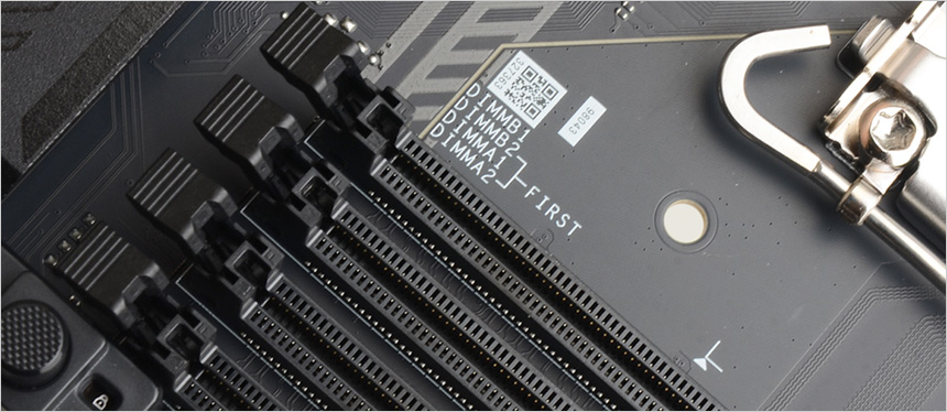 고급형 모델답게 4개의 메모리 슬롯이 제공되며 최대 9200+ MT/s 의 DDR5 OC 메모리 사용이 가능하다. XMP 셋팅을 제공해 기본 메모리 뿐만 아니라 고클럭을 지원하는 튜닝램을 장착해 성능을 높일 수 있으며 메모리 장착 우선순위가 메인보드에 프린팅 되어 듀얼채널 구성시 빠르게 메모리를 장착할 수 있다.