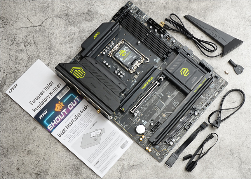 풀KIT의 모습으로 메인보드를 비롯해 퀵 매뉴얼과 Wi-Fi 안테나, SATA 케이블이 제공되며 손쉽게 SSD를 장착할 수 있도록 EZ M.2 클립이 포함된 것을 확인할 수 있다. 또한 프런트 패널 커넥터, EZ Conn 케이블, EZ M.2 클립 리무버 등도 지원한다. (사용설명서는 PDF 파일로 제공된다.)