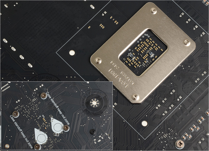 메인보드 바닥면의 모습으로 깔끔하게 디자인된 것을 확인할 수 있다. 특히 스탠드 오프나 기타 이물질과 잦은 접촉으로 인한 메인보드 고장을 미연에 방지하도록 Aviod Collision Zone을 적용한 것이 눈에 띈다.