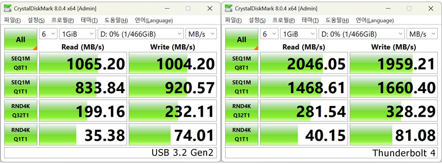 썬더볼트 4 단자를 지원해 초고속 데이터 전송이 가능하다. 상단의 사진은 USB 3.2 Gen2x2 지원 외장 SSD를 장착해 속도 테스트를 진행하고 있는 모습으로 2,000MB/s 가 넘어가는 빠른 속도를 보여주었다. 대용량의 데이터를 다루는 유저들이라면 유용하게 활용할 수 있을 것이다. (USB 3.2 Gen2x2 지원제품을 사용해야 최대 속도를 즐길 수 있다. 외장 SSD 구입시 스펙을 확인하기 바란다.)