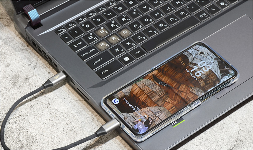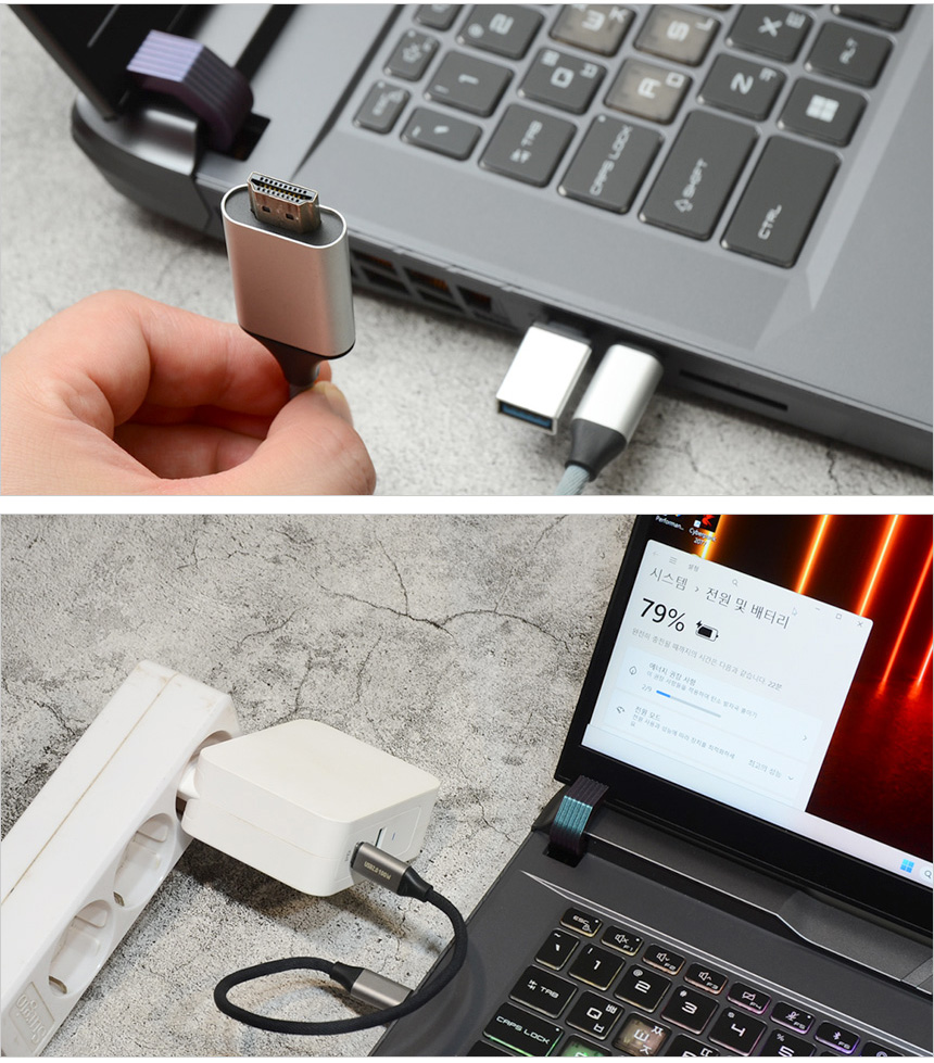 상시전원을 지원해 노트북이 꺼진 상태에서도 스마트폰을 충전할 수 있다. (단, 노트북 전원이 연결되어 있어야 한다.) 상단의 사진은 테스트를 진행하고 있는 모습으로 전원이 공급되어 충전이 가능한 것을 확인할 수 있었다. (집이나 사무실에서 스마트폰 충전기를 설치할 필요가 없다.)