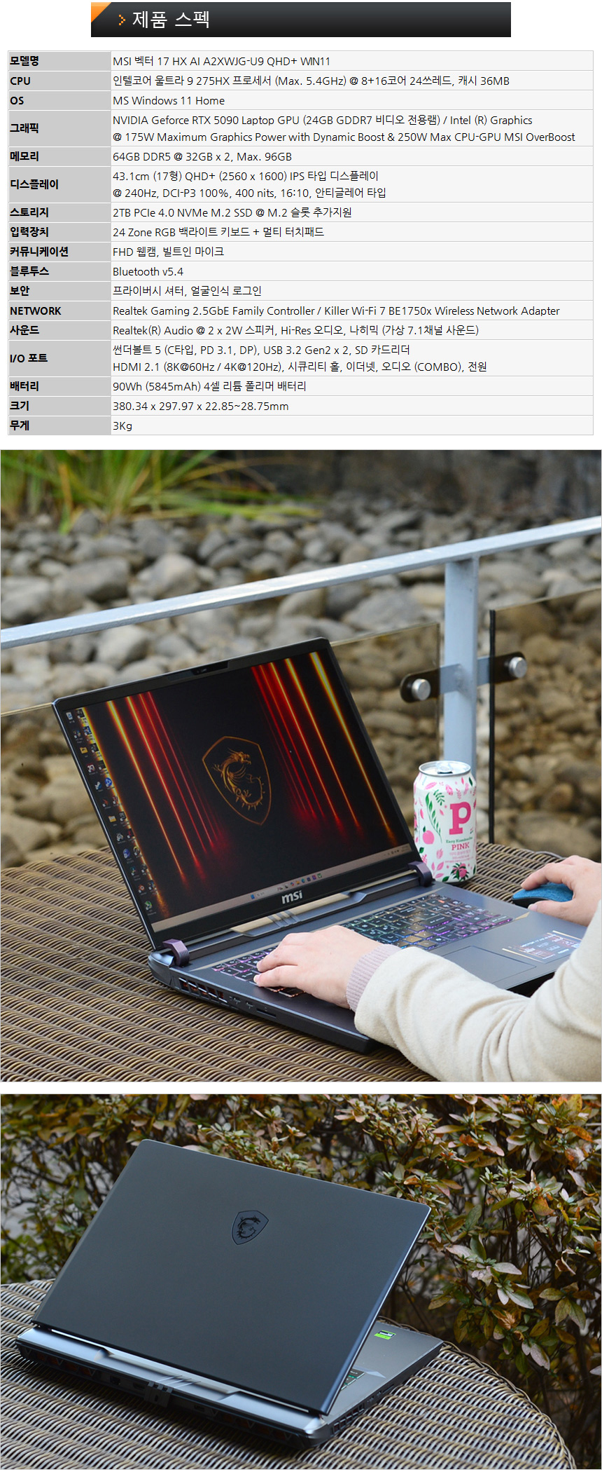 17형 대화면에서 QHD+ 해상도 지원으로 디테일 까지 살린 IPS 타입 디스플레이를 탑재했으며 (240Hz 지원으로 FPS 게임도 완벽하게 즐길 수 있다.) 쿨러부스트 5 기술을 적용해 장시간 고성능으로 작동해야 하는 노트북이 안정적으로 작동하도록 돕는다. 또한 2TB 대용량 SSD를 탑재해 여유롭게 최신 게임을 설치해 즐길 수 있으며 썬더볼트 5, PD충전 등을 지원해 편하게 노트북을 사용할 수 있다.