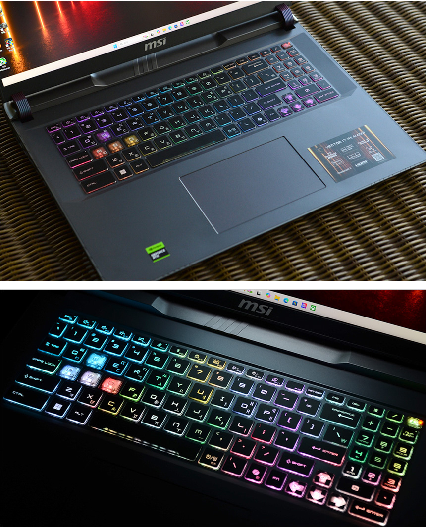 키보드의 모습으로 17형 대화면을 지원하는 노트북 답게 텐키를 포함한 풀사이즈 치클릿 키보드를 장착했다. 24존 RGB 키보드가 장착되어 화려한 조명 효과를 즐길 수 있으며 S/W를 통해 컬러나 효과를 사용자에 맞게 설정할 수 있다. (WASD와 방향키의 주목성을 높인점도 무척 마음에 든다.)