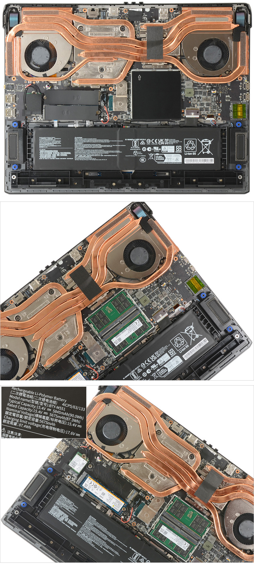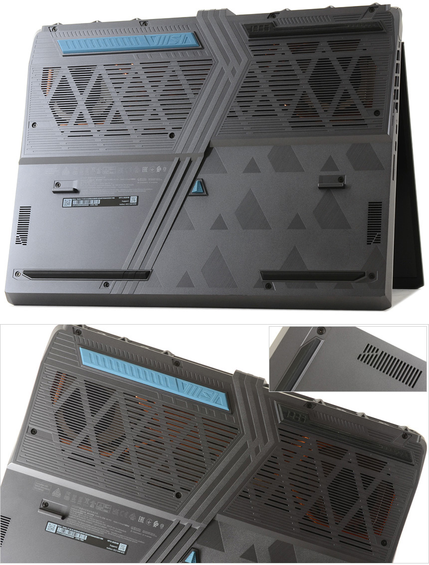 바닥면 내부의 모습으로 2개의 팬과 6개의 히트파이프, 4개의 통풍구로 구성된 쿨러부스트5 쿨링 솔루션을 지원해 열을 빠르게 식혀주고 뜨거워진 공기는 빠르게 외부로 방출한다. (팬이 최대 속도로 동작해 빠르게 열을 식힐 수 있는 쿨러부스트 기능을 단축키로 제공한다.) 또한 하단에는 5845mAh 용량의 리튬이온 배터리가 설치되어 있고 스피커가 장착되어 있다.