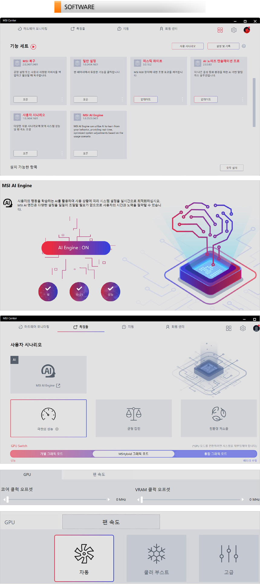 MSI 센터의 실행 모습으로 사용자가 원하는 S/W를 선택해 설치할 수 있다. 유저 시나리오를 통해 퍼포먼스를 설정할 수 있으며 극한의 성능을 선택하면 GPU의 오버클럭이 가능하며 팬속도도 사용자가 원하는 대로 설정할 수 있다. 또한 내장그래픽의 간섭없이 외장그래픽 만으로 게임을 즐길 수 있는 GPU 스위치 기술이 제공되는 것도 눈에 띈다. (긴 배터리 사용시간을 필요로 할 경우 내장그래픽으로 작동하는 통합 그래픽 모드를 선택하기 바란다.) @ MSI AI 엔진을 선택하면 노트북의 상태와 용도에 따라 최적의 컨디션을 유지할 수 있도록 자동 조절해 준다.