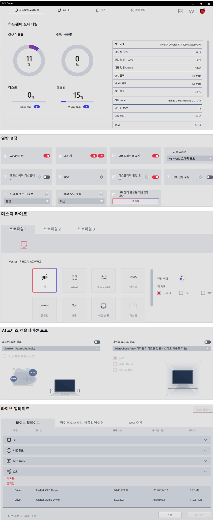 윈도우키와 키보드 백라이트, USB 상시전원 등을 설정할 수 있으며 시스템 업데이트 지원으로 최신의 컨디션을 유지할 수 있다. 또한 복구 기능 지원해 랜섬웨어나 기타 해킹등으로 문제가 발생했을 때 빠르게 시스템을 복원할 수 있다. 또한 시스템 모니터링을 지원하며 노이즈 캔슬링과 미스틱 라이트 (조명) 설정도 가능한 것을 확인할 수 있다.