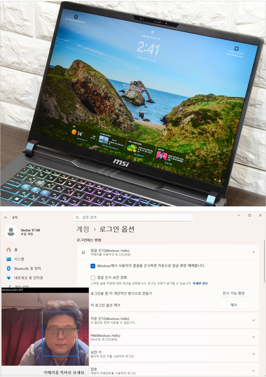 IR 카메라가 설치된 노트북으로 얼굴인식 로그인을 사용할 수 있다. 설정-계정에 있는 로그인 옵션에서 윈도우즈 헬로를 사용할 수 있으며 얼굴을 등록해 빠른 로그인이 가능하다. 인식율도 뛰어나 편하게 사용할 수 있을 것이다. (동영상을 자세히 확인하기 바란다.)