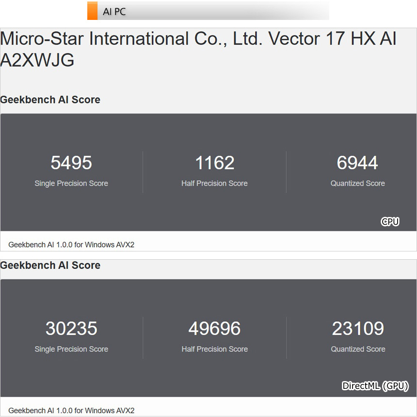AI 전용 벤치마크 툴을 이용해 AI 성능 테스트를 진행하고 있는 모습으로 최상급의 CPU와 고성능 GPU가 탑재된 모델답게 일반 노트북과 확연하게 비교되는 높은 스코어를 보여주었다. 특히 GPU의 AI 스코어는 일반 노트북을 압도하는 수준이다.