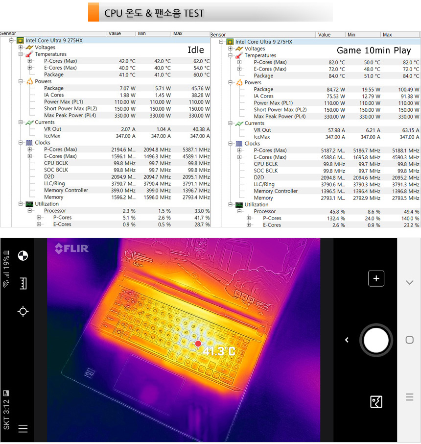 CPU 온도 테스트를 진행하고 있는 모습으로 (실내온도 18도) 아무것도 하지 않는 Idle 상태에서는 40도 초반으로 작동했으며 10분간 게임을 실행했을 때 80도 중반까지 온도가 올라갔다. (순간적으로 90도로 올라가곤 했지만 대부분의 상황에서 80 대를 유지했다.) 또한 열화상 카메라를 이용해 게임 실행시 노트북의 열분포를 확인하고 있는 모습으로 CPU와 GPU가 설치된 중앙부를 중심으로 열이 자연스럽게 퍼져나가며 측면과 후면의 통풍구를 통해 열이 빠져나가는 것을 확인할 수 있다. 팜래스트 온도는 낮아 열로 인한 스트레스 없이 손을 올려두고 노트북을 사용할 수 있다.