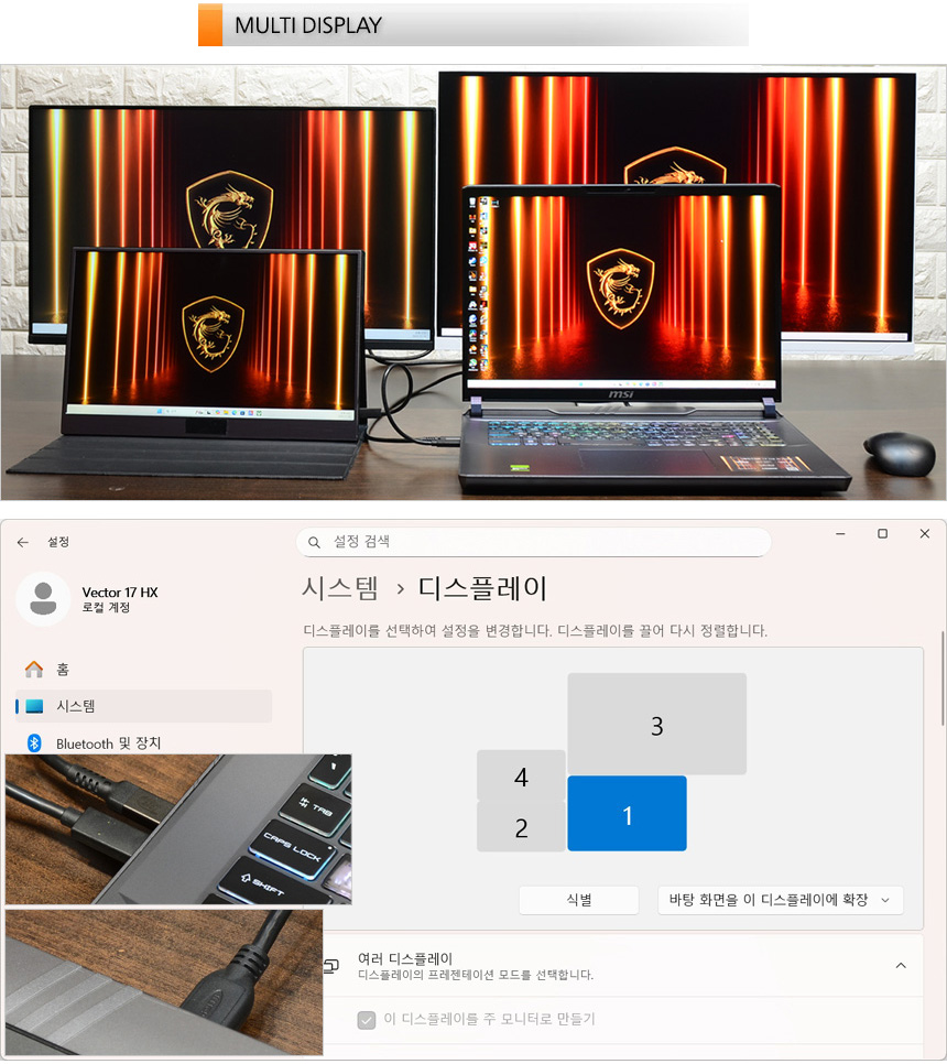 HDMI 뿐만 아니라 2개의 썬더볼트 5 단자도 영상 출력을 지원해 총 3개의 디스플레이를 사용할 수 있다. 다중창 사용이 필수적인 업무나 학습용으로도 유용하게 활용할 수 있으며 4K 모니터 연결도 가능해 전문작업도 용이하게 실행할 수 있다. (3개의 디스플레이를 활용하고자 할 경우 MSI 센터에서 그래픽을 MS하이브리드로 설정하기 바란다.)