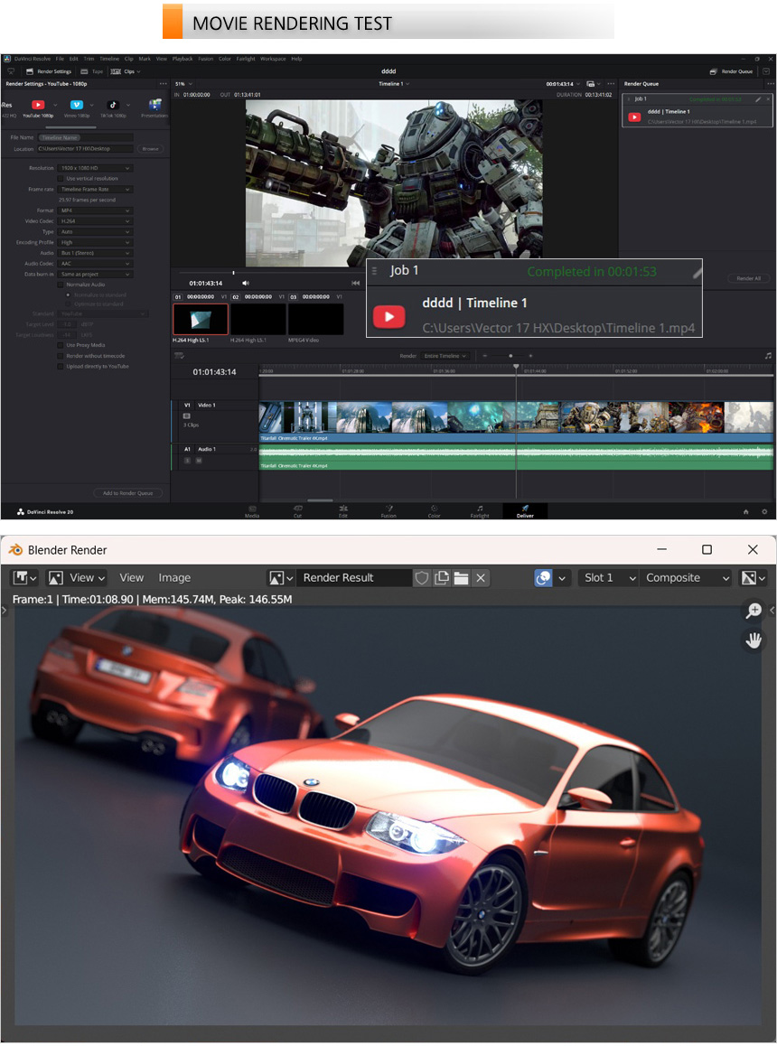 영상편집 S/W 다빈치 리졸브를 이용해 랜더링 테스트를 진행하고 있는 모습으로 (640MB, 920MB, 990MB 4K 동영상을 단일 동영상으로 랜더링, FHD 해상도에 H.264 비디오 코덱) 1분 53초가 소요되는 것을 확인할 수 있었다. 또한 블랜더 랜더링 테스트 에서는 1분 20초가 소요되었다. @ 최상급의 CPU를 사용한 모델답게 엄청난 성능을 보여주었다. 영상편집은 물론 캐드나 3D 등의 용도로도 사용 가능한 노트북이다.