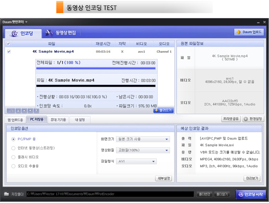 다음 팟인코더를 이용해 4K 동영상의 인코딩 테스트를 진행하고 있는 모습으로 3분 00초의 짧은 인코딩 시간을 보여주었다. (일반 게이밍 노트북 대비 20초 이상 짧은 인코딩 시간을 보여주었다.)