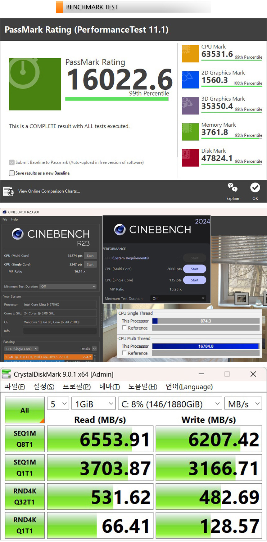 벤치마크 프로그램을 이용해 성능 테스트를 진행하고 있는 모습으로 300만원 미만대의 게이밍 노트북을 압도하는 높은 스코어를 보여주었다. 특히 CPU 스코어 대단히 높은 것이 인상적이었다. 게이밍은 물론 전문가용 S/W를 구동하는 용도로도 충분히 활용할 수 있을 것이다. 또한 저장장치의 속도를 확인해 보았는데 PCIe Gen4 SSD가 기본 장착되어 6000MB/s 이상의 빠른 읽기 속도를 지원하는 것을 확인할 수 있다. 2TB 용량을 지원하고 여분의 슬롯을 제공해 대용량 데이터를 손쉽게 저장할 수 있고 최신 게임을 여유롭게 설치해 플레이 할 수 있다.