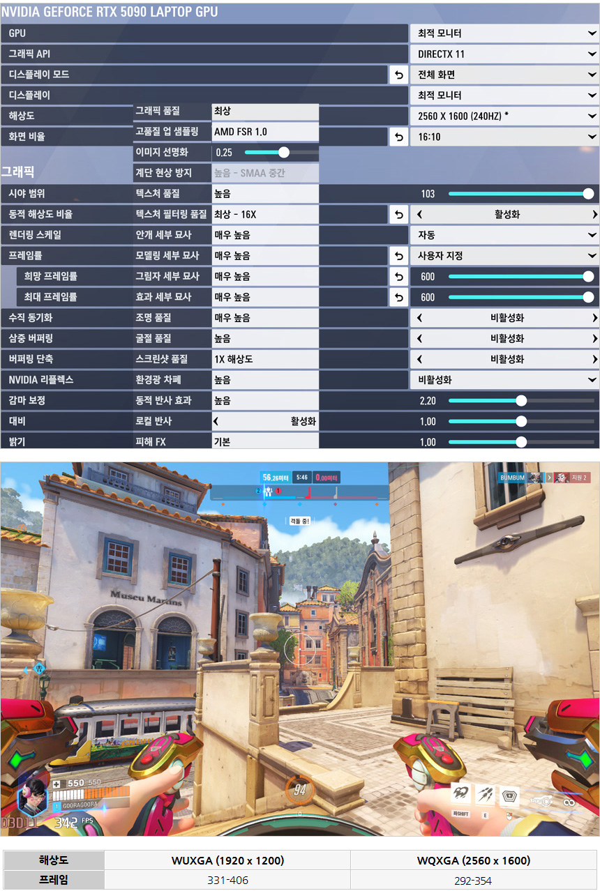 오버워치2를 이용해 게임 테스트를 진행하고 있는 모습으로 최상 옵션을 설정했을 때 QHD+ 기준 300프레임 대로 게임이 가능하다. 풀옵션에서도 240Hz 주사율을 활용하는데 전혀 문제가 없다.