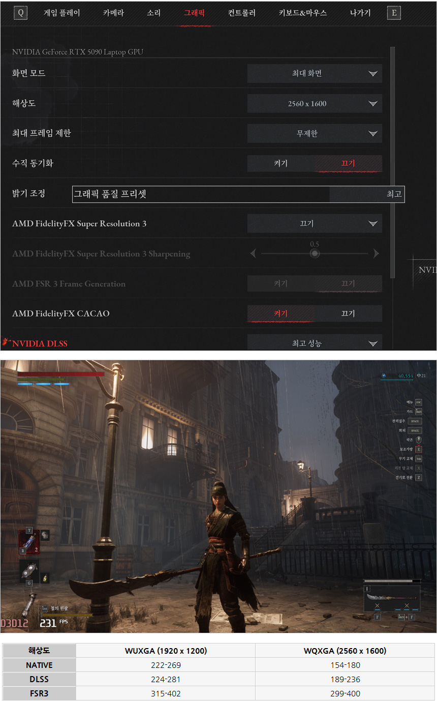 P의 거짓을 최고 옵션에서 플레이 하고 있는 모습으로 업스케일링 기술을 적용하지 않아도 엄청난 프레임을 보여주었다. 이 게임은 FSR3에서 프레임 생성이 활성화 되어 DLSS 대비 프레임이 상당히 높아지는 것을 확인했다. DLSS 보다는 FSR3를 활용하기 바란다.