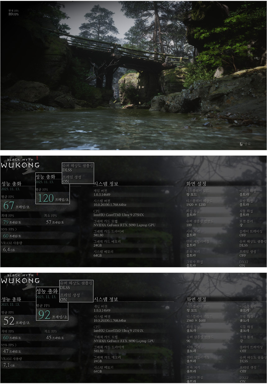 검은신화 오공 벤치마크를 울트라 옵션에서 실행한 모습으로 기본 설정에서는 프레임이 높지 않지만 DLSS를 이용해 프레임을 생성하면 성능이 높아져 부드럽게 게임을 즐길 수 있다.