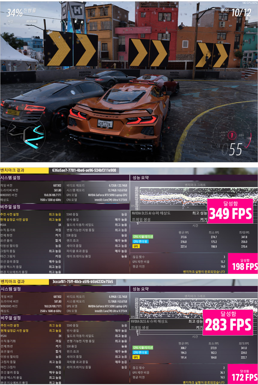 포르자 호라이즌 5를 최고 옵션으로 설정해 실행한 모습으로 QHD+ 해상도에서도 100 프레임 후반대의 높은 성능을 보여주었다. DLSS를 적용하면 300 프레임에 육박하는 높은 성능을 보여주어 더 부드럽게 게임을 즐길 수 있다.