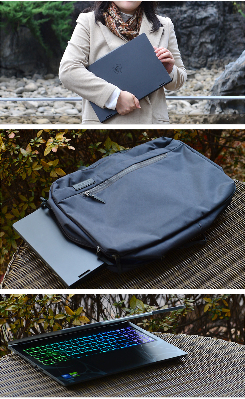 15.6형 대화면 노트북이지만 슬림 베젤을 적용해 크기를 최소화 했으며 비슷한 스펙의 고성능 게이밍 노트북 대비 무게도 가벼운 편이다. 상단에서 언급한 것과 같이 백팩을 사용하면 다양한 장소에서 게임을 즐기거나 고성능을 필요로 하는 작업을 할 수 있다. (출장이나 파견등으로 외부에서 고성능 노트북을 사용해야 하는 유저들에게 좋은 대안이 될 것이다.)