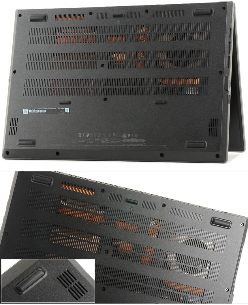 노트북 바닥면의 모습으로 칩셋과 팬이 설치된 상단에 통풍구를 제공해 안정성을 높였으며 상단과 하단에는 고무패드가 부착되어 미끄러짐을 방지한다. 또한 스피커가 장착되어 시원한 사운드를 즐길 수 있다. @ 전원설정을 균형조정 (밝기 50%, 내장그래픽, 슈퍼배터리 모드, 에어플레인) 으로 지정하고 슬라이드쇼를 무한 반복해 본 결과 8시간 50분 동안 재생된 후 시스템 대기모드로 진입하는 것을 확인할 수 있었으며 노트북을 끄고 1시간 충전 했을 때 86% 배터리가 충전되었다.
