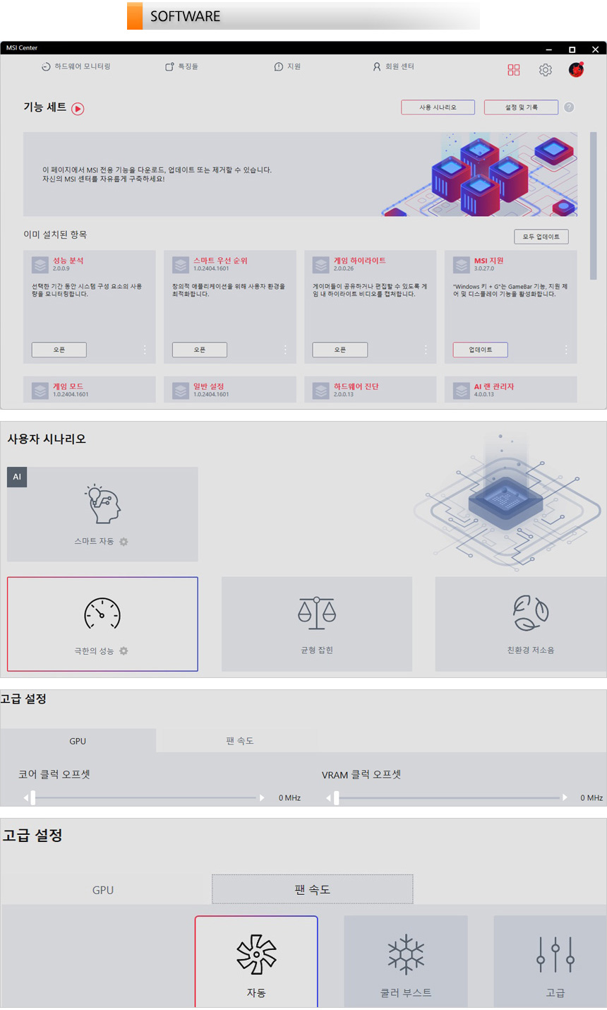 MSI 센터는 S/W를 선택해 설치할 수 있는 모듈형으로 구성되어 있다. 유저 시나리오를 통해 퍼포먼스를 설정할 수 있으며 극한의 성능을 선택하면 GPU의 오버클럭이 가능하며 팬속도도 사용자가 원하는 대로 설정할 수 있다.