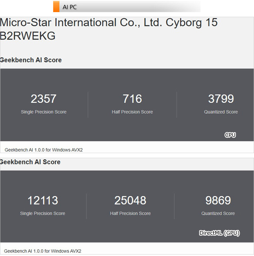 AI 전용 벤치마크 툴을 이용해 AI 성능 테스트를 진행하고 있는 모습으로 내장그래픽 기반의 보급형 노트북과 확연하게 비교되는 높은 스코어를 보여주었다. 다양한 AI 애플리케이션을 편하게 사용할 수 있을 것이다.