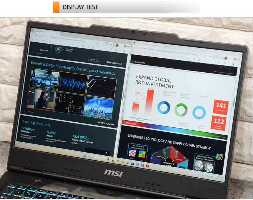 15.6형 대화면에 FHD 해상도를 지원해 여유롭게 멀티테스킹을 즐길 수 있다. 슬림 베젤 적용으로 몰입감을 높였을 뿐만 아니라 안티글레어 타입이 적용되어 반사 등으로 인한 불편도 없었다.