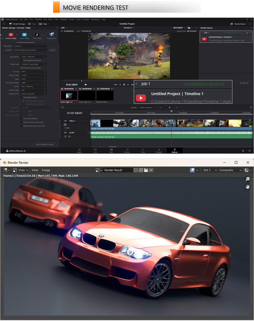 영상편집 S/W 다빈치 리졸브를 이용해 랜더링 테스트를 진행하고 있는 모습으로 (640MB, 920MB, 990MB 4K 동영상을 단일 동영상으로 랜더링, FHD 해상도에 H.264 비디오 코덱) 2분 53초가 소요되는 것을 확인할 수 있었다. 또한 블랜더 랜더링 테스트에서도 3분 54초가 소요되었다. @ 작업용으로도 충분히 사용할 수 있는 빠른 속도를 보여주었다.