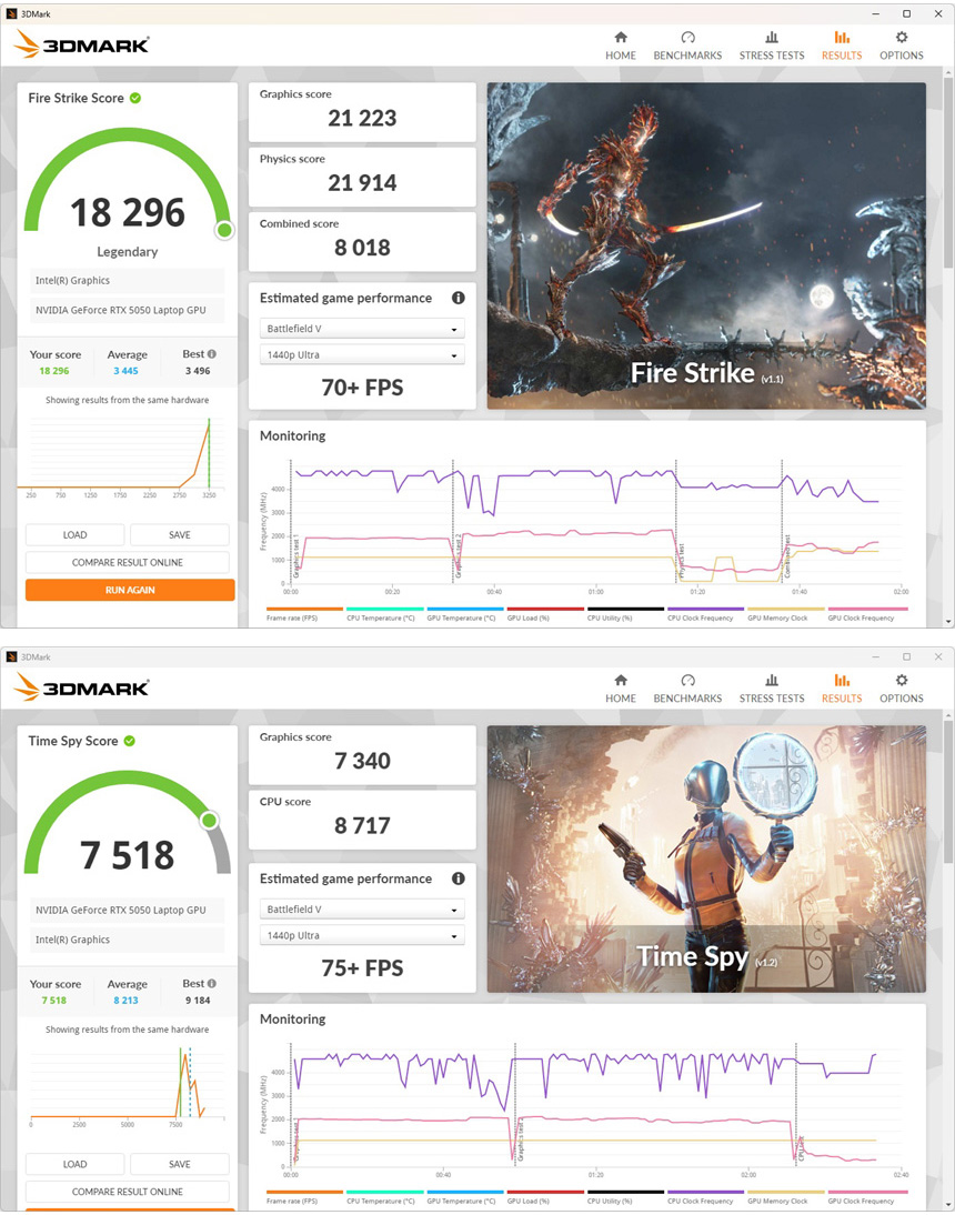3DMARK를 이용해 3D 성능을 확인하고 있는 모습으로 대부분의 게임을 상위 옵션에서 즐길 수 있는 스코어를 보여주었다. @ RTX 4060 랩탑 GPU와 성능이 대동소이한 하다.