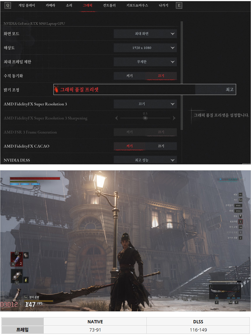 스텔라 블레이드를 플레이 하고 있는 모습으로 DLSS를 적용하면 프레임이 대폭 향상되어 부드럽게 게임을 즐길 수 있다.