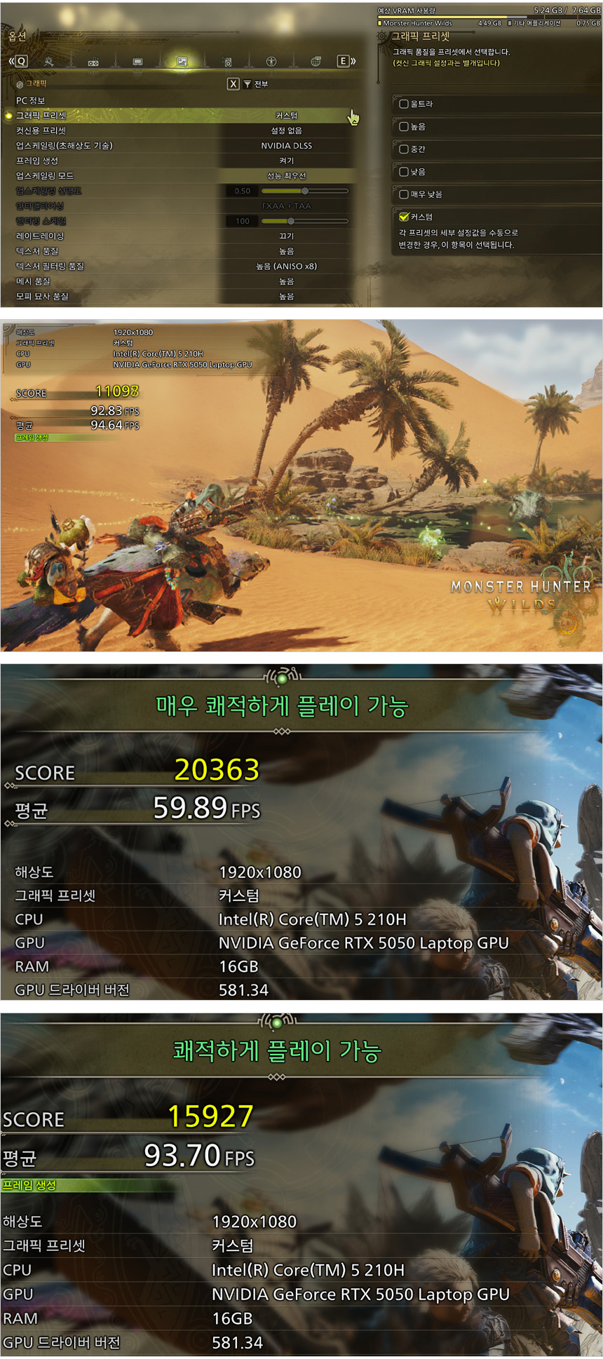몬스터 헌터 와일드 벤치마크를 높음 옵션으로 실행한 모습으로 DLSS를 활용하면 프레임이 대폭 상승한다. DLSS의 프레임 생성을 활성화 해 게임을 즐기기 바란다.