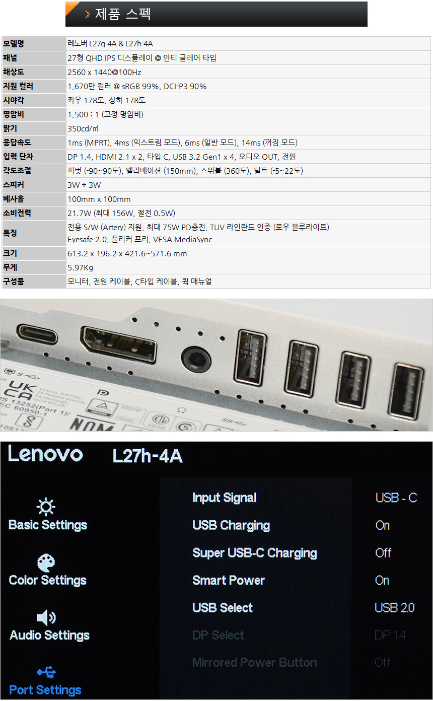 그에 반해 레노버 L27h-4A 모델은 DP 와 HDMI 뿐만 아니라 C타입 단자와 4개의 USB A타입 단자를 지원해 주변기기 연결이 용이하며 (USB 허브로 활용할 수 있다.) C타입 디스플레이 연결을 지원하는 스마트폰이나 노트북, 게이밍 핸드헬드와 편하게 연결해 사용할 수 있다. 특히 C타입 단자는 75W PD충전을 지원해 노트북이나 스마트폰 충전용으로 활용할 수 있다. @ C타입과 USB 단자를 제외하고 레노버 L27q-4A 와 L27h-4A 의 모든 스펙은 동일하다.