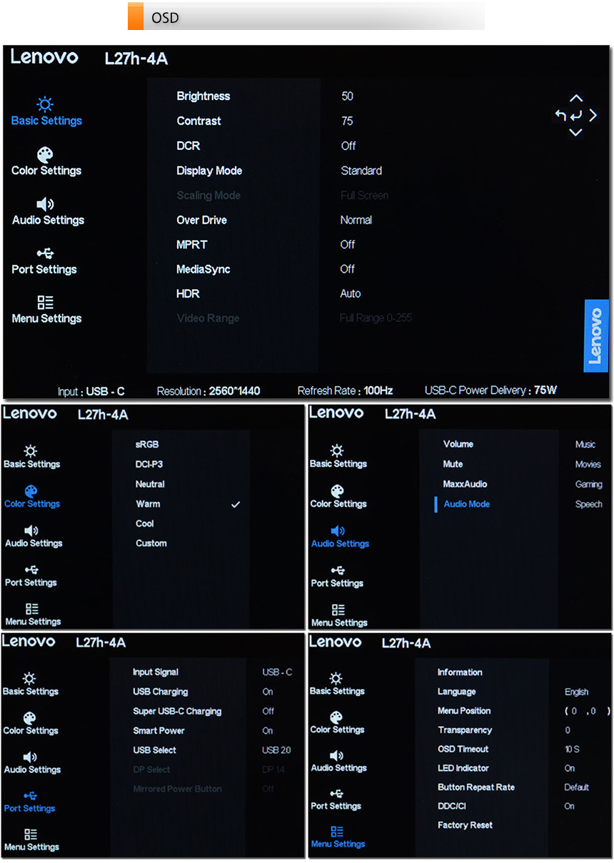 OSD 의 모습으로 명암과 밝기 조정은 물론 HDR 설정이 가능한 것을 확인할 수 있으며 다양한 디스플레이 모드와 컬러 셋팅이 가능하다. 또한 C타입 단자를 지원하는 L27h-A4 의 경우 포트 셋팅 메뉴를 통해 PD충전 설정과 USB 속도 설정이 가능하다.