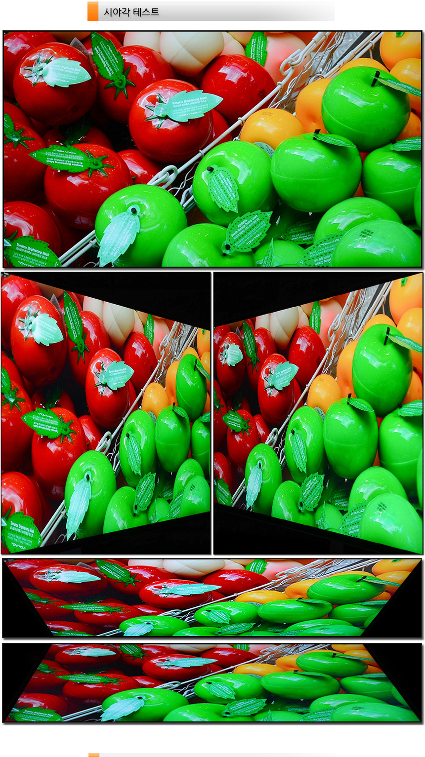 IPS 패널을 탑재해 어떤 각도에서도 선명한 영상을 즐길 수 있다. 상단의 사진은 시야각 테스트를 진행한 모습으로 극단적인 각도에서도 채도저하나 반전은 발생하지 않는 것을 확인할 수 있었다. VA이나 TN 계열의 패널과는 확연한 차이를 경험할 수 있을 것이다.