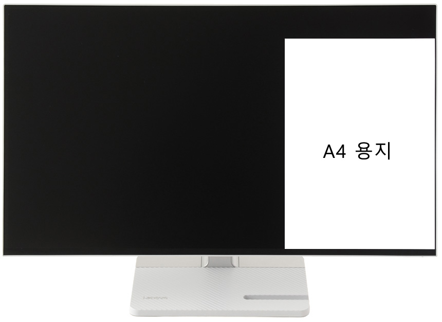 모니터 전면부의 모습으로 27형의 크기와 QHD (2560 x 1440) 해상도를 지원한다. 4면 슬림베젤을 적용해 높은 몰입감을 제공할 뿐만 아니라 듀얼 모니터 구성시 경계선으로 인한 불편을 최소화 했으며 (스크린대 바디비율 92%에 달한다.) 안티글레어 타입을 적용해 반사로 인한 스트레스 없이 작업에 집중할 수 있다.