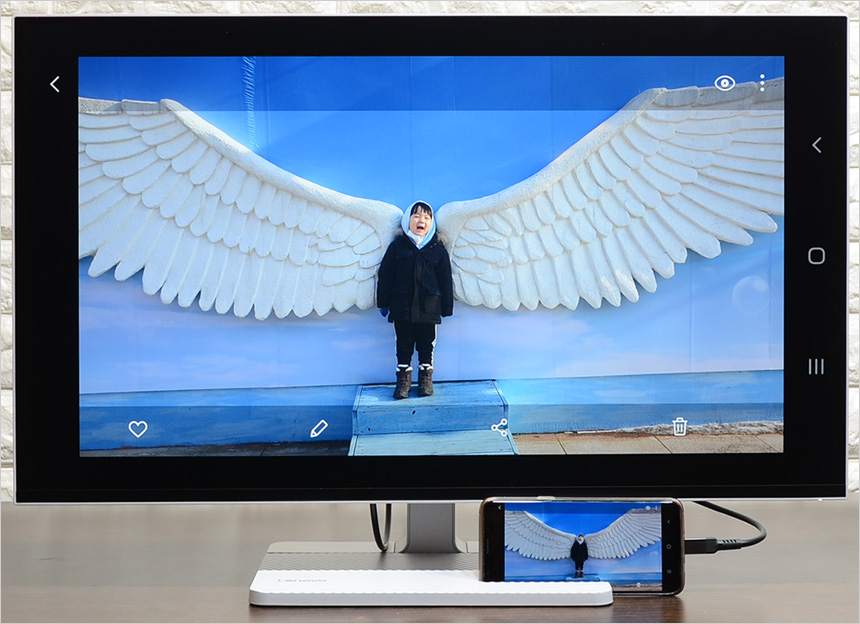 미러링 지원 스마트폰과 연결해 스마트폰 영상을 대화면으로 즐길 수 있으며 전력도 공급되어 스마트폰 충전용으로 유용하게 활용할 수 있다. (고속충전 지원으로 충전시간이 상당히 짧은 것을 확인할 수 있었다.)