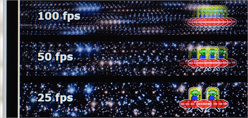 60Hz~75Hz 주사율을 지원하는 일반 모니터와 달리 100Hz 주사율을 지원해 게임에서 순간적인 움직임도 정확하게 확인하고 대응할 수 있다. 특히 1ms (MPRT) 설정도 지원해 잔상등의 스트레스 없이 게임에 몰입할 수 있다. 상단의 사진은 100Hz 주사율을 쉽게 확인할 수 있도록 하위 프레임과 같이 재생되는 영상 (960 Pixel Per Sec) 을 셔터스피드 1/20 로 촬영한 모습으로 프레임이 높아질수록 시간당 많은 화면이 뿌려지기 때문에 캐릭터의 수가 많은 것을 확인할 수 있다.