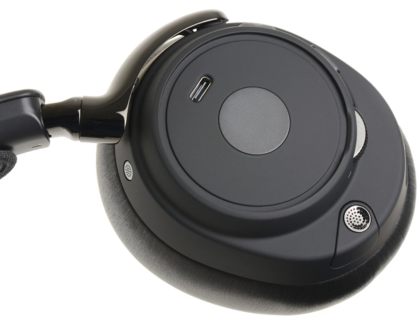 왼쪽 유닛의 모습으로 3.5mm 오디오 단자를 비롯해 전원 버튼과 마이크 음소거 버튼, 볼륨조절 다이얼이 제공되는 것을 확인할 수 있다. 또한 액티브 노이즈 캔슬레이션을 위한 마이크가 설치된 것도 눈에 띈다. (이 제품은 4-마이크 하이브리드 시스템으로 명료한 사운드를 제공한다.)