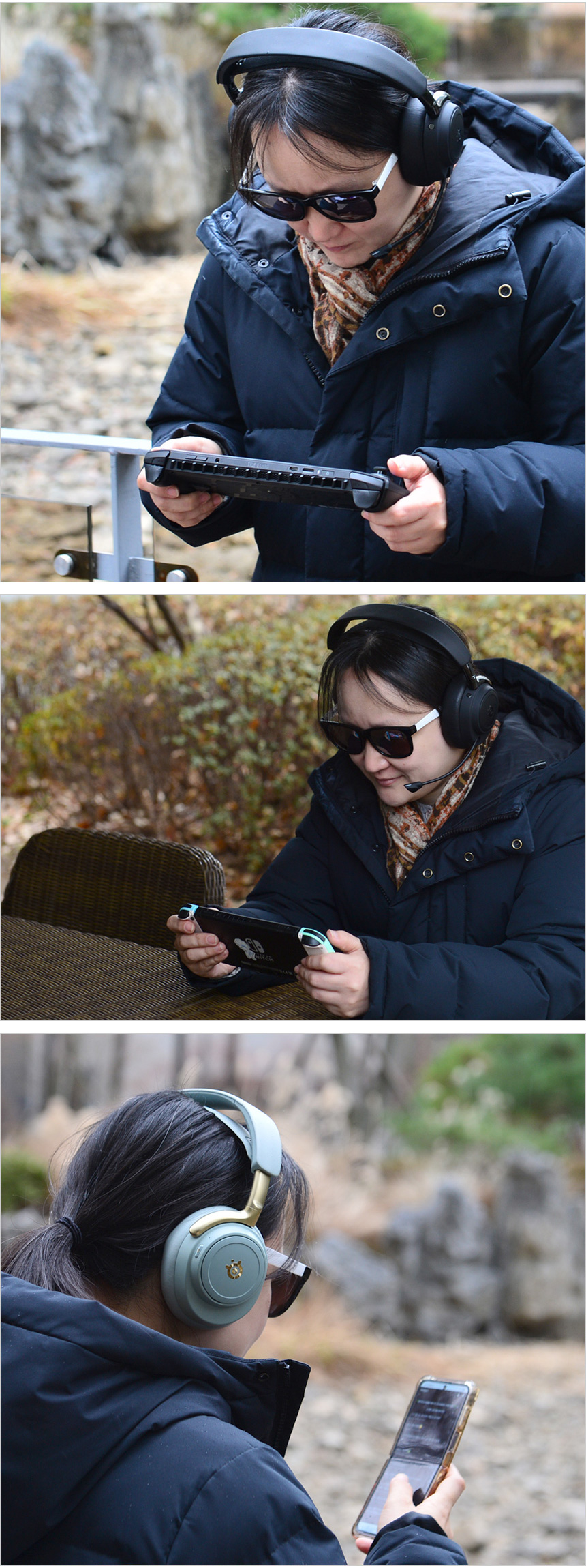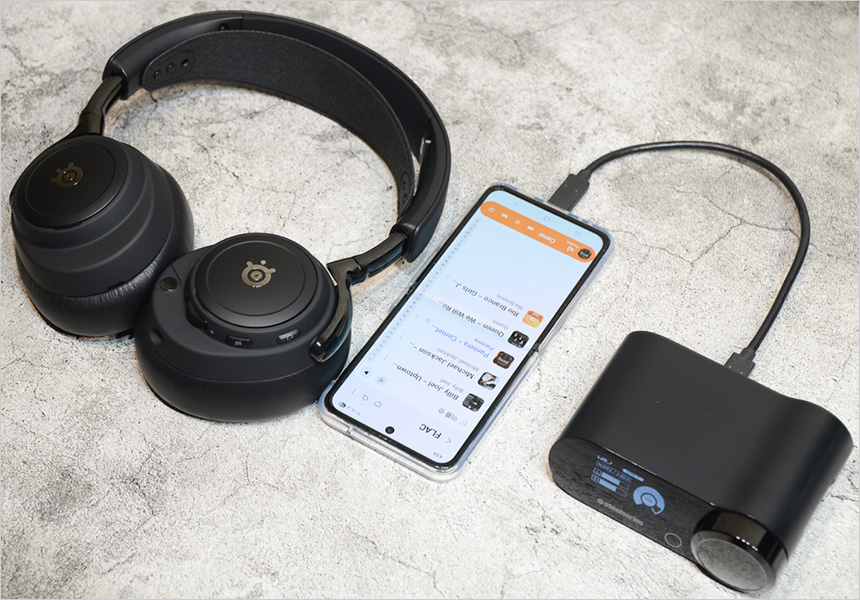 사운드 테스트를 진행하고 있는 모습으로 블루투스를 사용하지 않고 게이밍 허브를 스마트폰과 직접 연결했으며 음손실이 있는 MP3 파일을 사용하지 않고 무손실 음원인 FLAC (24bit/192kHz) 파일을 저장해 테스트를 진행했다.