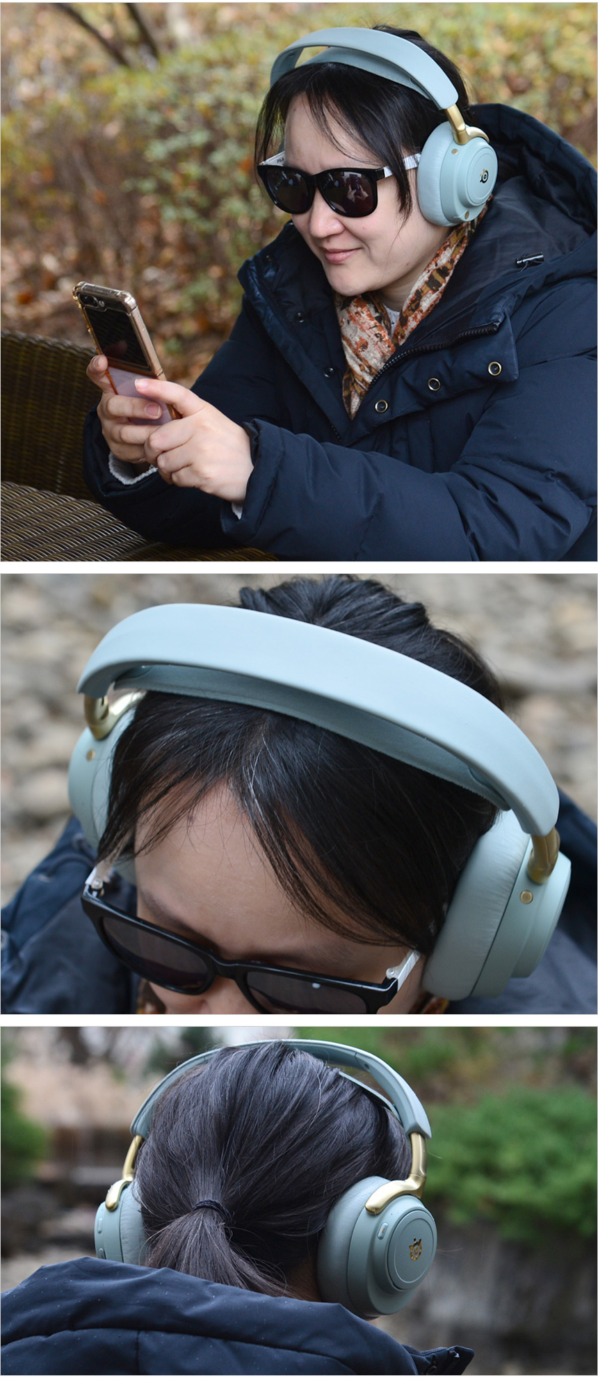 착용감 테스트를 진행하고 있는 모습으로 컴팩트한 헤드폰이나 헤드셋과는 무게차가 느껴졌다. 하지만 디자인 부분에서 언급한 것과 같이 과도하게 무겁지는 않아 목에 부담을 주지 않았다. 유닛 자체의 길이 조절이 가능할 뿐만 아니라 지지대 내부의 고무밴드 길이 조절도 가능해 머리가 큰 필자도 편하게 길이를 조절해 사용할 수 있었으며 (최대 길이로 늘렸을 때 여유가 있었던 몇몇 모델들과 달리 딱 맞는 느낌이었다.) 헤어밴드가 쿠션 역할을 해 정수리 등의 통증은 발생하지 않았다.
