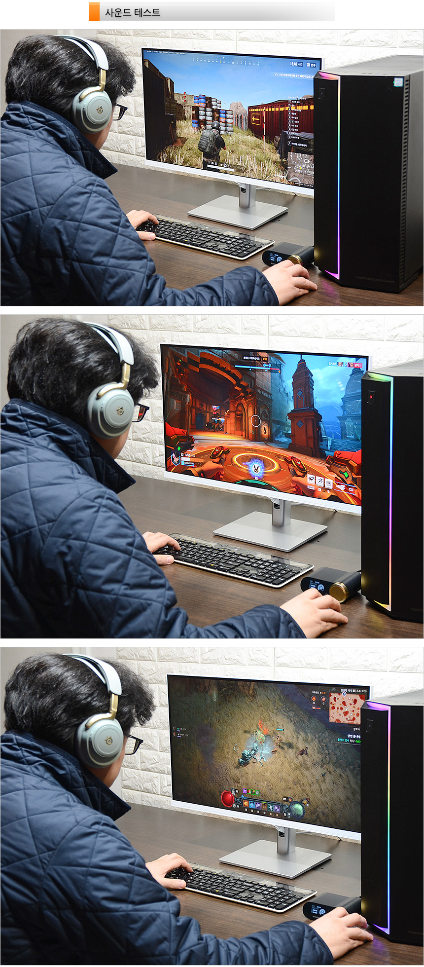 FPS 게임 배틀그라운드와 오버워치 2를 실행한 모습으로 출력 자체가 상당히 높아 보급형 모델과는 확연히 다른 폭발적인 사운드를 즐길 수 있었다. 또한 기본적으로 차폐성이 뛰어나고 유닛의 크기도 커 귀 전체를 감싸는 입체감 넘치는 사운드를 들려주었으며 게이밍 허브가 마우스 바로 앞에 셋팅되어 빠르고 편하게 볼륨을 조절할 수 있었다.