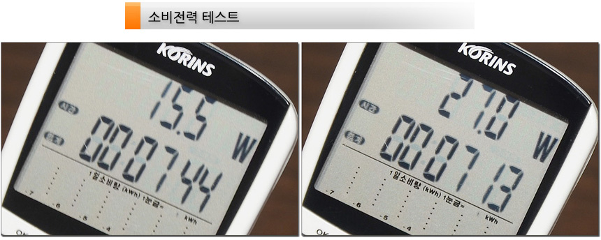 소비전력 테스트를 진행하고 있는 모습으로 100% 밝기에서 27W 였으며 50% 밝기에서는 15.5W로 소비전력이 줄어드는 것을 확인할 수 있었다. (대기 모드에서는 0.5W) 전기세 걱정없이 사용할 수 있을 것이다. (사무실에서 50% 밝기로 사용했을 때 전혀 답답함이 없었다.)