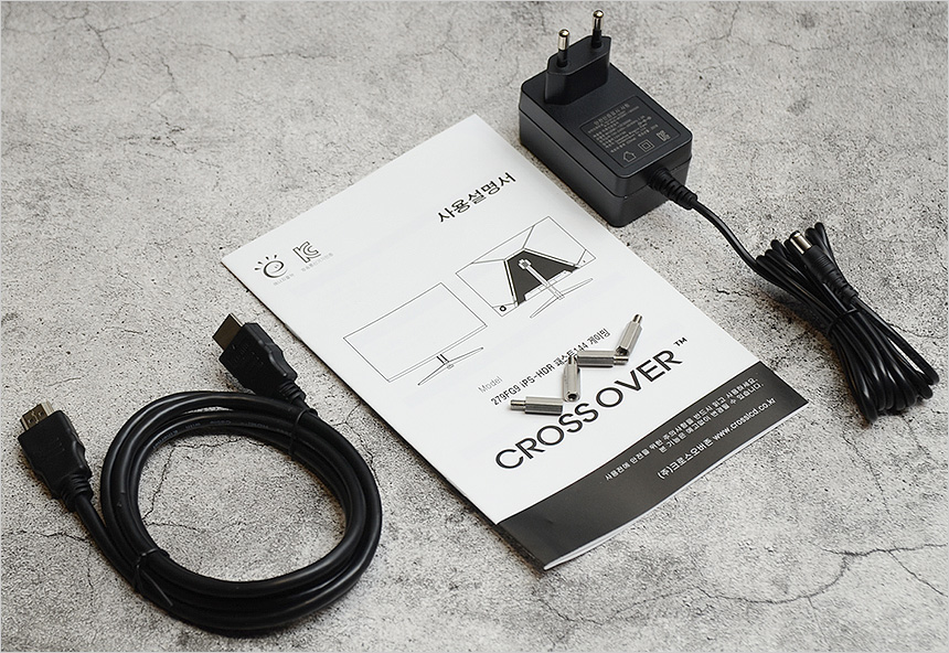 풀KIT 의 모습으로 모니터와 사용 설명서, 케이블 일체형 전원 어댑터가 제공되며 HDMI 케이블이 포함된 것을 확인할 수 있다.