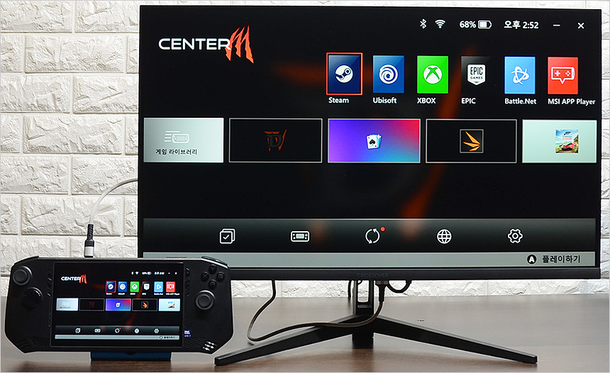 노트북과 HDMI로 연결한 모습으로 원활하게 작동하는 것을 확인할 수 있었다. 집이나 노트북사무실에서 대화면으로 노트북을 사용하고 싶을 경우 좋은 대안이 될 것이다. 또한 많은 유저들이 사용하는 게이밍 UMPC와 연결해 대화면으로 게임을 즐길 수 있다. 상단의 사진은 게이밍 UMPC 연결 테스트를 진행하고 있는 모습으로 원활하게 동작하는 것을 확인할 수 있었다. (C타입 to HDMI 케이블을 사용했다.)