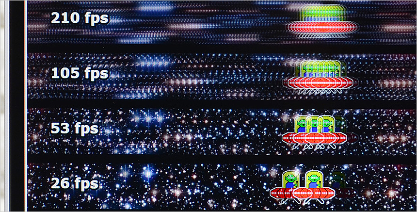 보급형 게이밍 모니터를 압도하는 210Hz 고주사율 지원으로 순간적인 움직임도 정확하게 파악하고 빠르게 대응할 수 있다. 또한 0.5ms 응답속도와 FPS 모드등 게이밍에 특화된 기술이나 기능이 제공되어 최신 게임을 즐기는데 부족함이 없다. 상단의 사진은 240Hz 의 높은 주사율을 쉽게 확인할 수 있도록 하위 프레임과 같이 재생되는 영상 (960 Pixel Per Sec) 을 셔터스피드 1/20 로 촬영한 모습으로 프레임이 높아질수록 시간당 많은 화면이 뿌려지기 때문에 캐릭터의 수가 많은 것을 확인할 수 있다. 직접 눈으로 영상을 볼 경우 210Hz 가 훨씬 자연스럽게 움직인다.