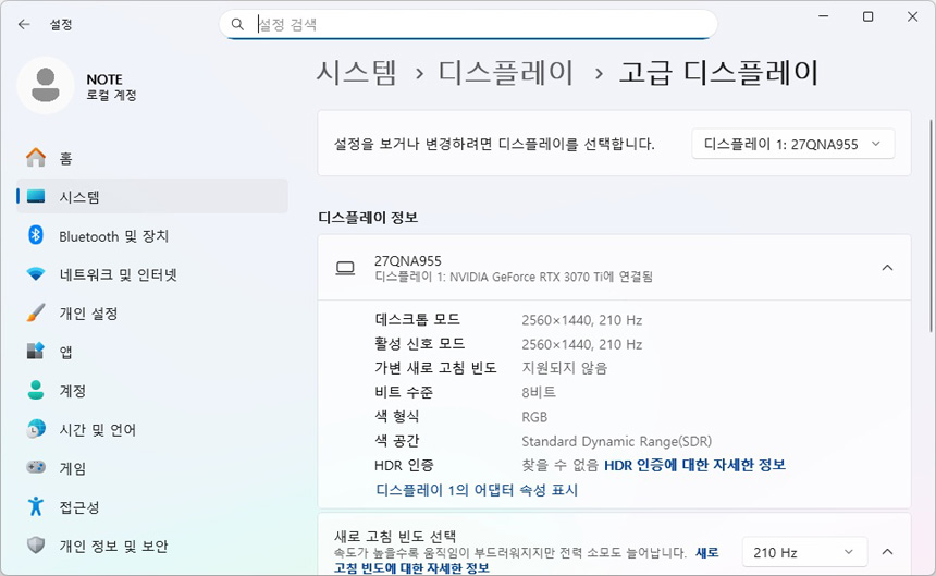노트북과 HDMI로 연결한 모습으로 원활하게 작동하는 것을 확인할 수 있었다. 대화면으로 노트북을 사용하고 싶거나 고성능 노트북을 게임 용도로 활용할 경우 좋은 대안이 될 것이다. (작업용 노트북의 경우 성능은 뛰어난데 패널의 주사율은 60Hz 인 경우가 많다. 이때 크로스오버 27QNA955를 연결하면 바로 게이밍 노트북으로 변신하게 된다.) 또한 게임콘솔이나 게이밍 UMPC등과 연결해 대화면으로 게임을 즐길 수 있다.